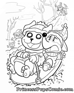 This gave me the rad idea of “The Pups should sled in the next coloring page!” That’s why you’ll find a very worried Corgi Pup riding on a long sled behind a super excited Pug Pup in this month’s first coloring page! Any coloring pages where I can fit all the pups into it are lots more fun, so you’ll find a frantic Fluff Pup watching from the top of the hill as TeaCup Pup and Scruffy Pup observe from mid-hill territory! (Scruffy Pup seems to have gotten stuck in the snow sculpture?!)