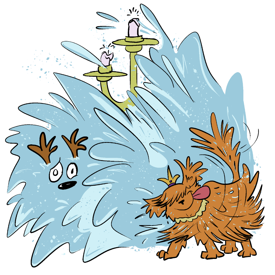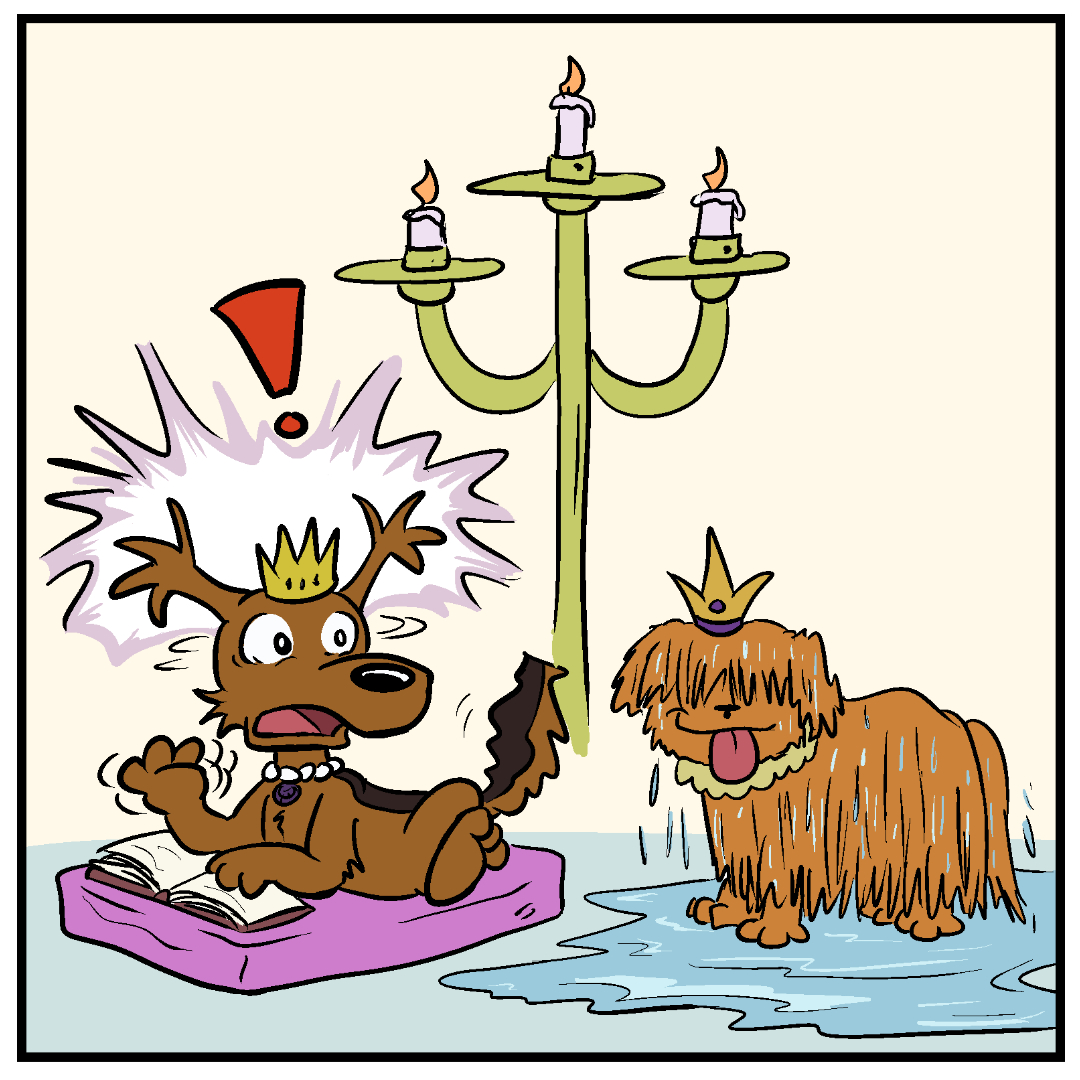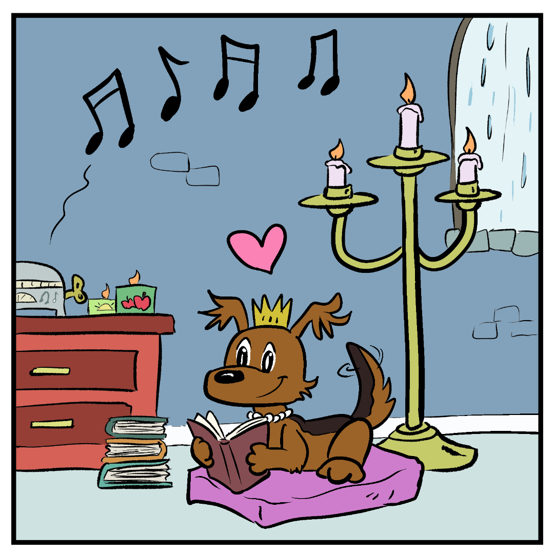 On rainy days, Fluff Pup just wants to get everything nice and cozy for some rainy day reading inside where it's nice and dry! But Scruffy Pup, however...